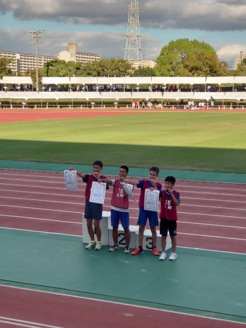 金岡陸上競技場で開催されております堺市民オリンピックにて、金岡校区のリレー女子チームが2位、男子チームが見事1位に輝きました。