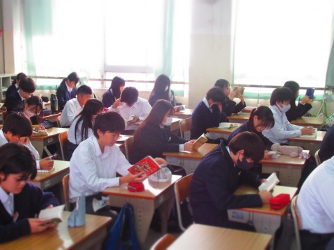 写真は、2年生朝読書のようすです。