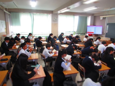 教室で全校集会を視聴する生徒たち。