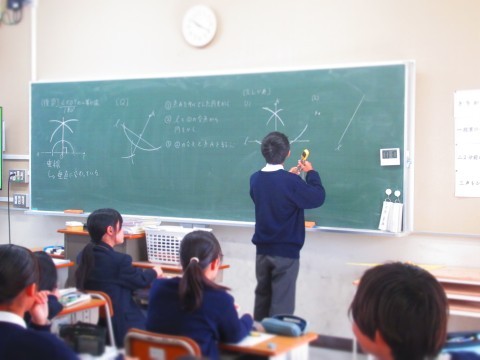 1年生理科の授業は、理科室を真っ暗にして何やら実験を。