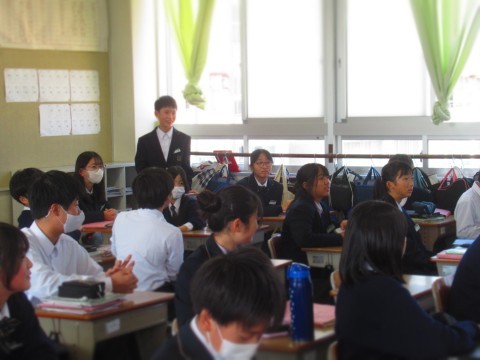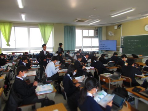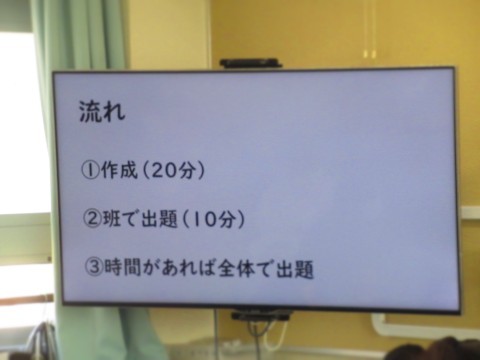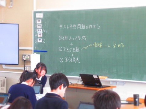 1年生社会科では、各個人でテスト問題を予想し班で話し合う時間を設けました。