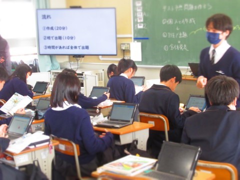 社会科の授業で、テストの予想問題を自分たちで作っています。