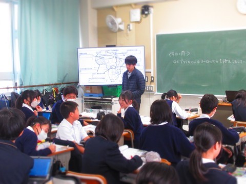 1年生社会科では、各個人でテスト問題を予想し班で話し合う時間を設けました。
