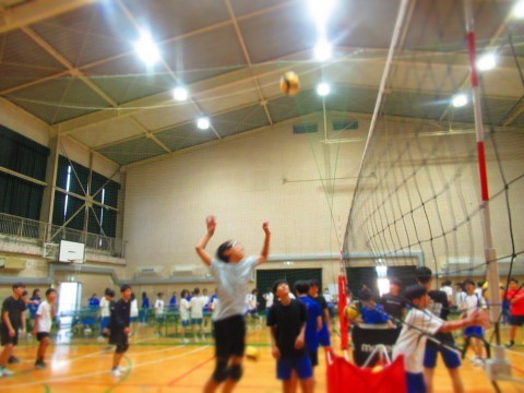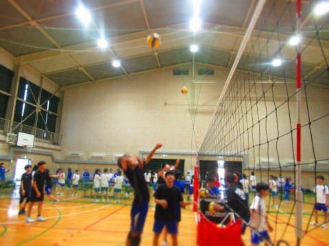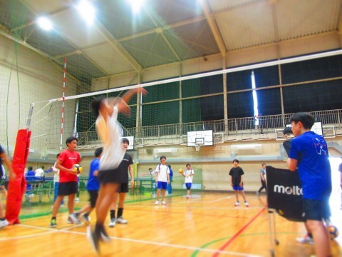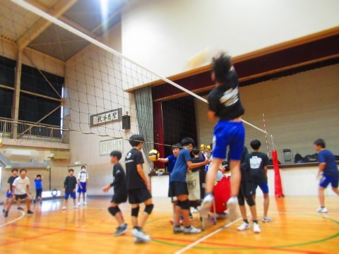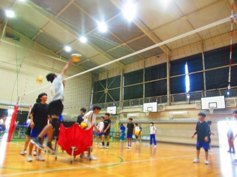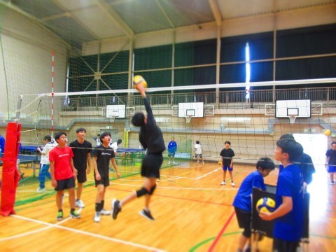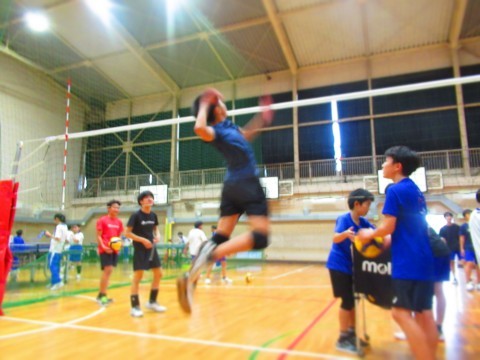 男子バレーボール部の練習(スパイク練習)では、思い切りジャンプをし、腕を振り下ろし凄まじいスピードボールを放っています。