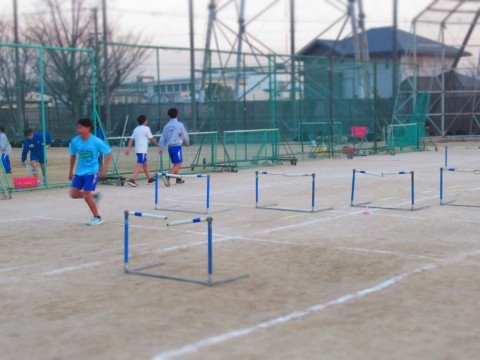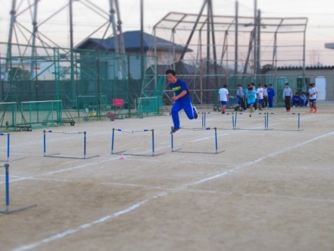 ハードル・棒高跳び・走り幅跳び・砲丸投げ・円盤投げ・長距離走に分かれ練習に励んでいます。