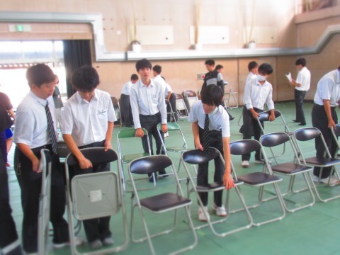 入学式の説明を教員から聞いています。座るタイミング、立ち方、礼の仕方などを練習。