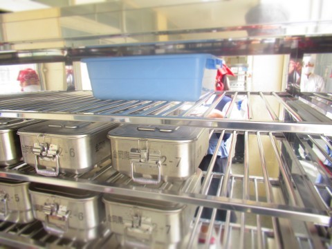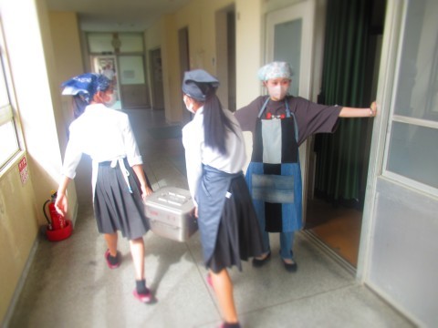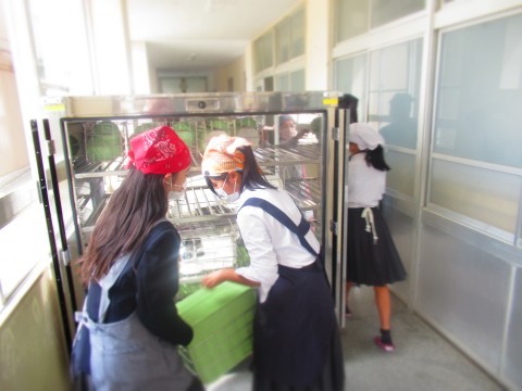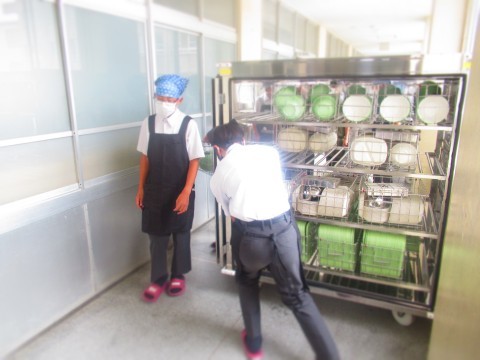 食缶・食器運び、配膳中のようすです。