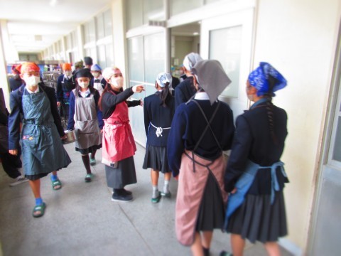 食缶・食器・牛乳を取りに来る3年生。