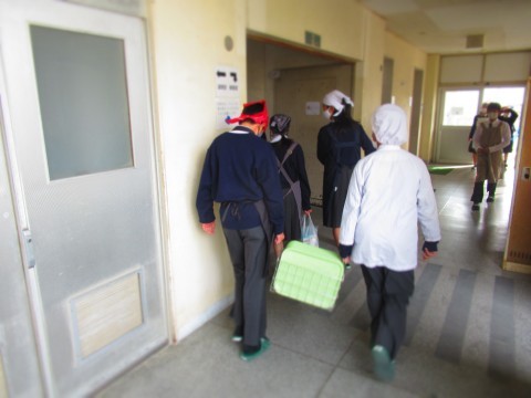 食器・食缶・牛乳を配膳室へ取りに来て教室へ運ぶ3年生。