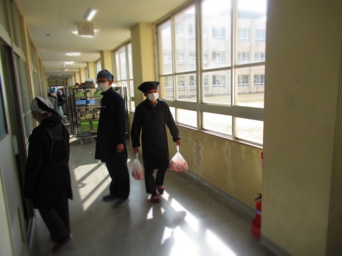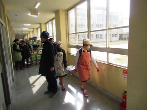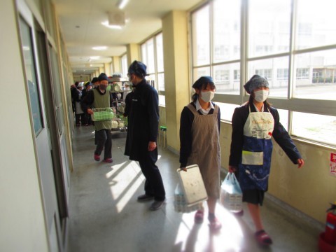 給食を取りに行くようす、教室で配膳するようすを紹介します。