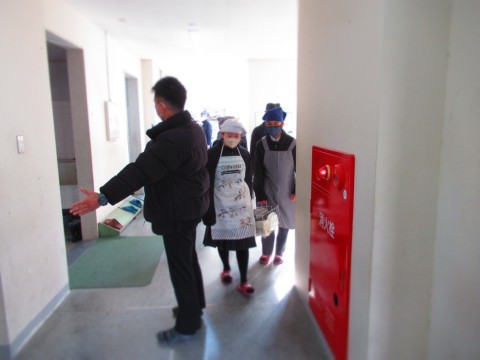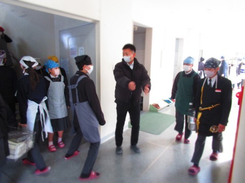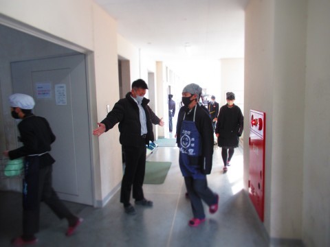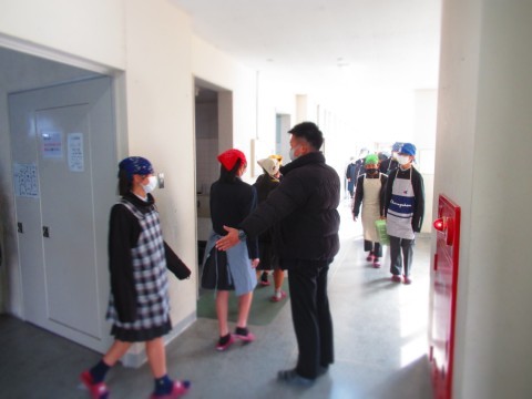 2年生の給食当番が通る際、教員が体を張り、生徒の安全確保に努めています。