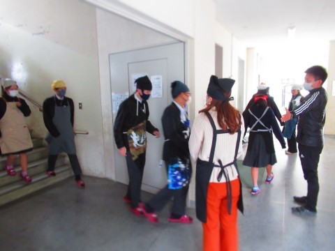 2年生の給食当番が通る際、教員が体を張り、生徒の安全確保に努めています。