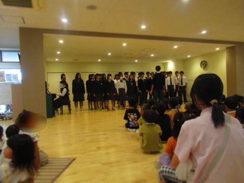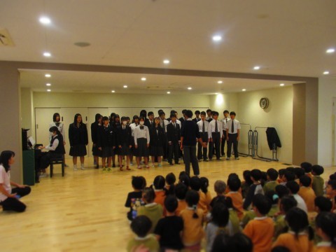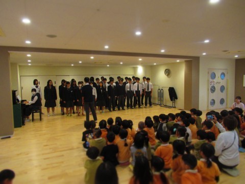 3年生合唱コンクールにて金賞を受賞したクラスは、学校近くのさかいゆめの樹こども園へ赴き、園児に歌声を披露しました。
