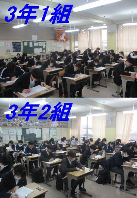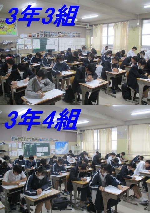 3年生の1限目の社会科のテストの様子です。3年生のこどもたちは先週に懇談会を行うなど,いよいよ進路選択の時期となりました。今回の期末テストも進路選択にとって重要なテストです。最後まであきらめず,自分の力を出し切ってください。がんばれ3年生!