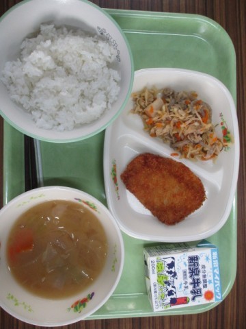 今日の給食です。メニューはチキンカツ,千切りイリチー,野菜たっぷりみそ汁でした。今日も美味しくいただきました。