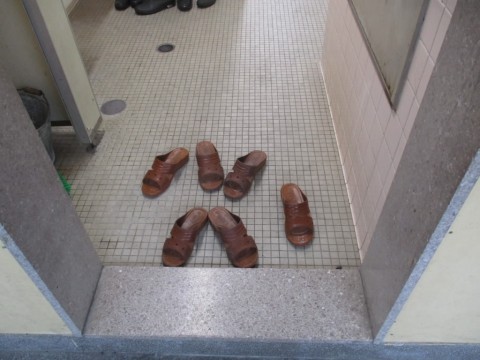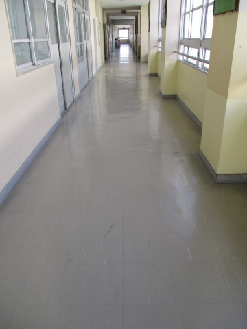 中央館1階から本館1階にかけての通路があります。本館の1階は、土足であがらないようにと注意喚起もしています。しかし、通り道として土足で歩いている人の姿を見かけます。教員も注意しますが、自分たちで意識してほしいです。