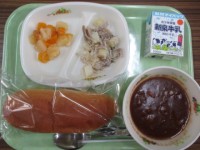 今日の給食です。メニューは焼きシューマイ,小松菜のソテー,麻婆豆腐でした。今日も美味しくいただきました。