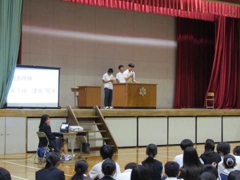 生徒会役員選挙 立会演説会 公開日 2025/10/03 更新日 2025/10/03 生徒会 本日,生徒会役員選挙立会演説会が行われました。立候補者は,どの生徒も壇上で堂々とした演説を行っていました。聞いている生徒も候補者の演説に真剣に耳を傾けていました。