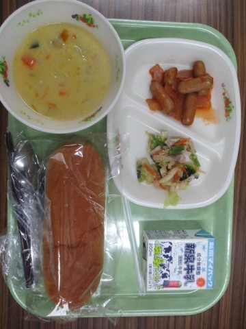 今日の給食です。メニューはコッペパン,カボチャのシチュー,ウインナーのケチャップ煮,野菜サラダ,ブルーベリージャムでした。今日も美味しくいただきました。