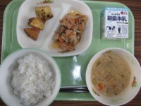今日の給食です。メニューは肉豆腐,ちくわの磯辺揚げ,五目汁でした。今日も美味しくいただきました。