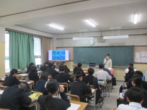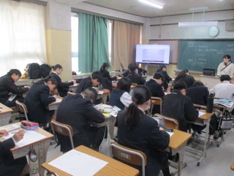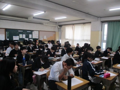 2年2組の1限目の授業は美術でした。題材は抽象表現で,音からイメージをふくらませ,絵で表現をしました。授業ではこどもたちがさまざまな「音」を聴いて,音から色や形を考え,色鉛筆で表現しました。こどもたちは楽しそうに取り組んでいました。