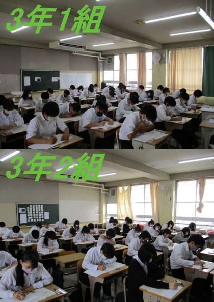 今日は1学期テスト2日目です。写真は3年生の1限目の英語のテストの様子です。3年生の子どもたちは今年は進路選択の年になります。自分の将来の夢に向かって、努力を積み重ねていきましょう。目標を早めに決めることも重要なポイントの一つです。今回のテストも自分の力をすべて出し切れるよう努力しましょう。がんばれ3年生!