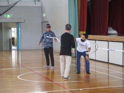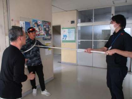 6限目に、校内に不審者が侵入した場合、職員の対応や生徒の安全確保、避難行動について訓練を行いました。その後、体育館に集合し、元警察官の須佐さんよりさすまたの使い方や、非行防止についてのお話をしていただきました。