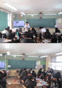 1年4組の4限目の授業は理科でした。単元名は「脊椎動物の特徴と分類」で今日の授業ではタブレットの発表ノートを活用し、自分が調べた動物の特徴をみんなの前で発表しました。子どもたちはエイ・コウモリ・カモノハシなど特徴のある動物を調べ、発表しました。子どもたちは友達の発表を興味深そうに聞いていました。