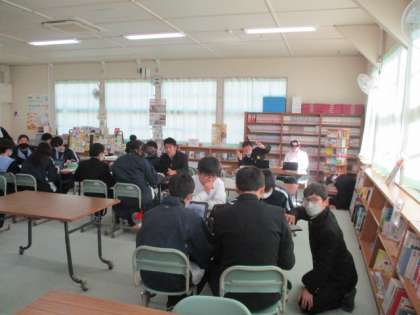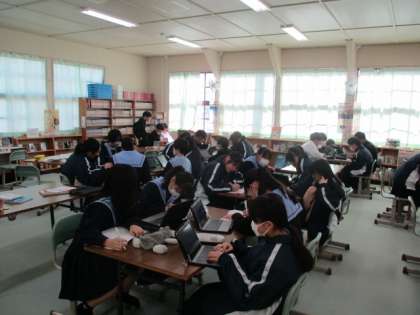 2年生の数学の授業の様子です。図書館で調べ学習を行っていました。