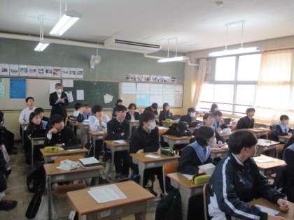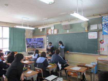 2年4組の2限目の授業は数学でした。単元名は「データの分布」で、今日の授業では班ごとに調べた「行きたい国や・住みたい国や地域の魅力を伝えよう」をパワーポイントを活用し、発表しました。子どもたちは自分たちが調べたことを、しっかりとクラスメイトに伝えていました。