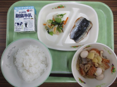 今日の給食です。メニューはおでん,焼きいわし,白菜と小松菜の煮びたしでした。今日も美味しくいただきました。