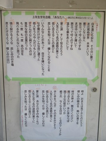 (あるクラスの発表を聞いて、すごく感動しました。『色々あったけど、最後はみんな一緒だよ』というのを、歌でみんなから教えてもらえた気がして。本当に、人は支えあって生きていくのだなぁと実感させてもらいました)