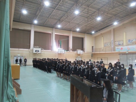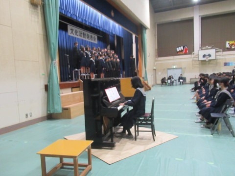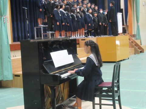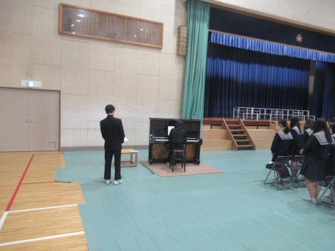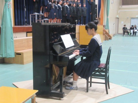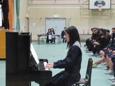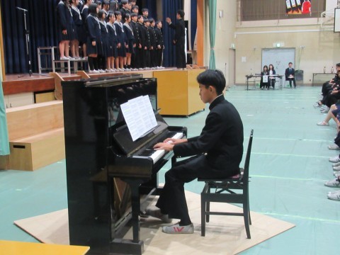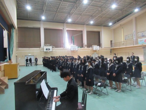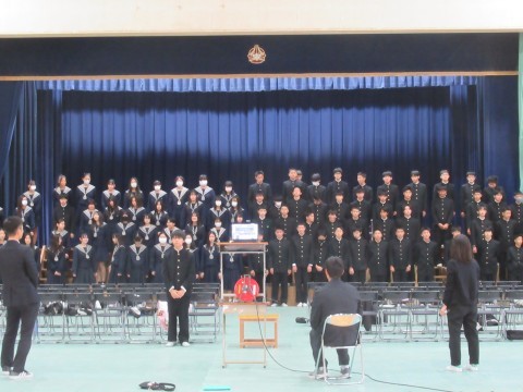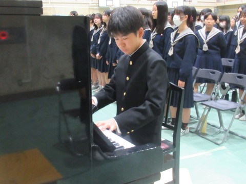 まずは、校歌斉唱。そのあとは、男子生徒による伴奏で、「翼をください」の斉唱。初めてのお披露目ということもあり、少し緊張をしている様子でしたが、最後まで弾ききることができました。そして、クラスの歌唱にうつります。今年度は3組⇒2組⇒1組の順で歌います。