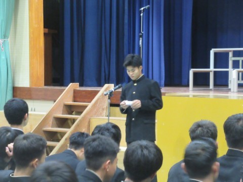 集会の内容は、「認証式(今期は2年生が委員長です)」「校長先生より、行事に取り組む姿勢について」「生徒指導主事より、身だしなみについて」「体育科主任より、体育大会について」「音楽科より、文化活動発表会について」など。