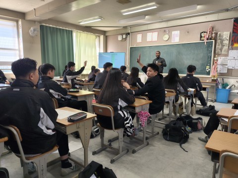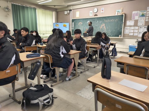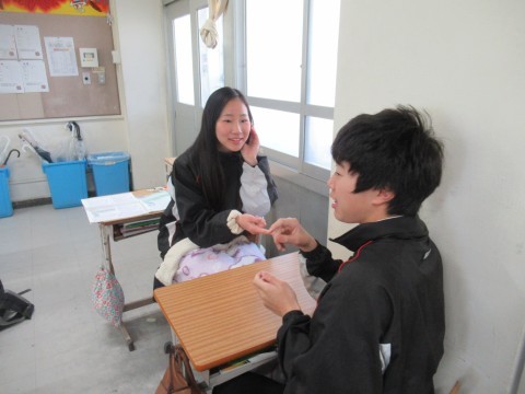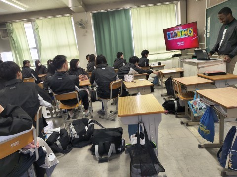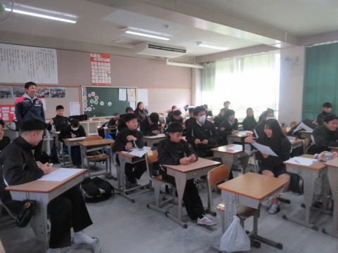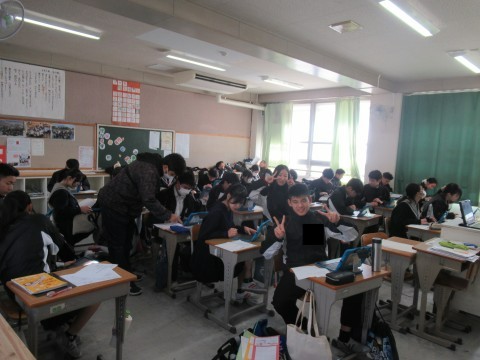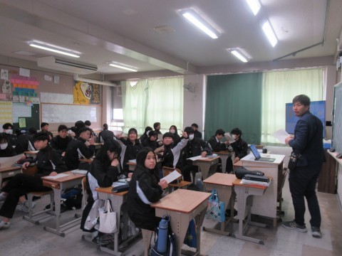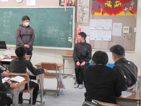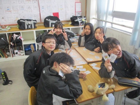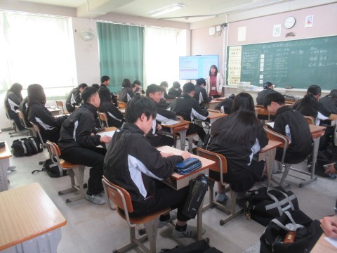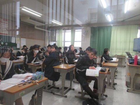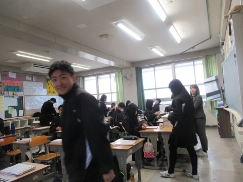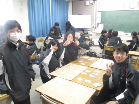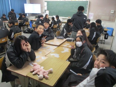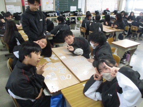 NSの先生に「このクラス、2時間目と6時間目、2コマ授業があるんだけど…」と相談すると、「じゃあ、ぼくが6時間目の授業をしてあげるよ」ということで、急遽6時間目はNSの先生の授業に!クリスマスが近いということもあり、最近学習した単元の文法も使いながら、アクティビティを!最後の大逆転劇には大盛り上がりで、最後には「先生ーありがとう!良いお年をー!」と、NSの先生に感謝の言葉を言う生徒もいました。3年生のNSの先生の授業は来年までありませんが、3学期も頑張っていきましょう!