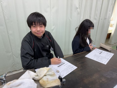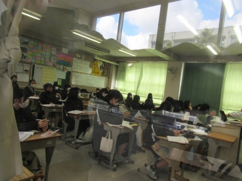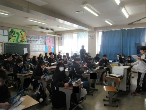 3組の数学は少人数授業。受験も近づいてきて、数学を苦手とする生徒も、TVの前まできて先生に質問をしていました。2組の理科の授業は、朝1バンだったからか、少し眠そうにしている生徒も。カメラに気づいて途中からピースをする人もいました。1組は美術の授業。篆刻が終わった生徒は、箱のイラストに色を塗る作業をしていました。