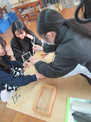 技術の授業では、グルーガンを使って「丈夫な製品を作る」ことについて考えています。グループで相談をしながら、上手に接着するには・高く積み上げるには、を考えていました!