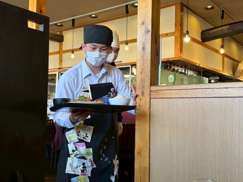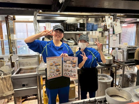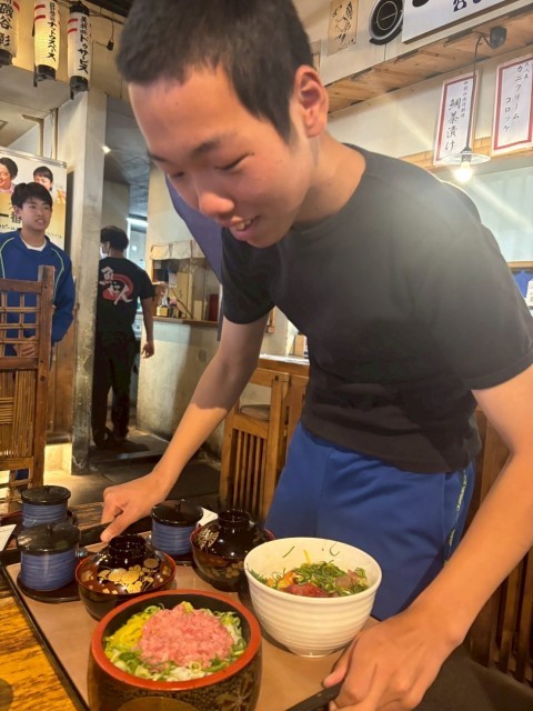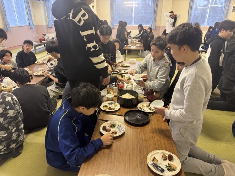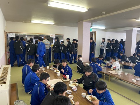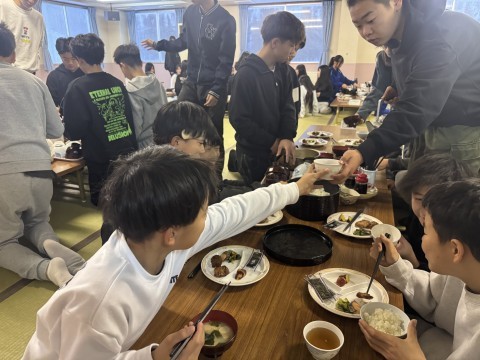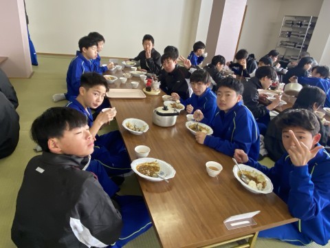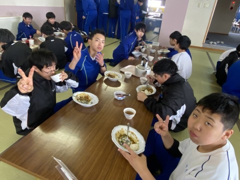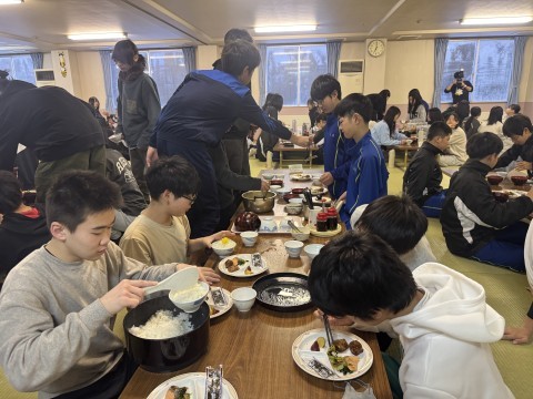 男子〜!お米にお味噌汁、おかわりおかわり〜!朝からたくさん食べてます!