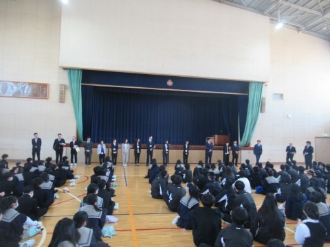 本日は始業式でした!初めて3学年集まっての集会。最初は緊張している様子でしたが、先輩たちが来るのを待っているとだんだんと緊張もほぐれたのか、笑顔も見られました。職員紹介では大きな拍手・歓声も!(ありがとう~!)