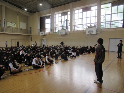 (部活動紹介の前に、先生から話をしました。「集団行動をする上で、みんながみんな好き勝手にはできない」「やりたいこと・挑戦したいことは、やらなければいけないこと・ちょっと我慢することの上にある」ということ。来週からの6時間授業に向けて、それぞれが協力できることを少しずつ。49期は、まだまだはじまったばかり。これから、これから)