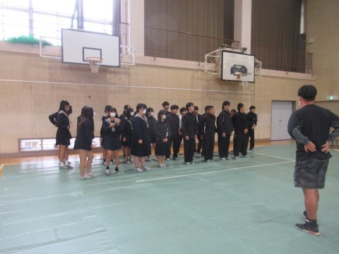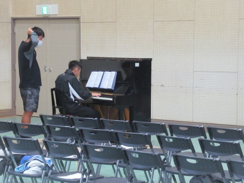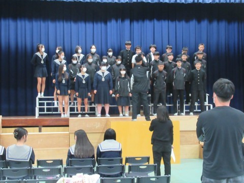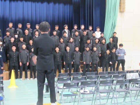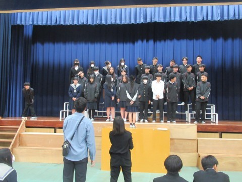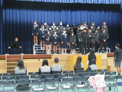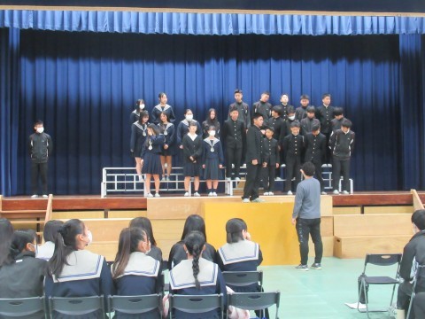 全体練習の様子です。今年は、「あなたへ」を学年合唱として歌います。各クラス、クラス別の合唱が終わった後、みんなで歌います。今日は動きのリハーサル(1番のみ歌唱)と、全体合唱をしました。どちらもまだまだ、体育館の大きさに負けている…!それでも「これはあかんな…」という印象ではなく、だんだん慣れてきたり「もっと出るよー!」と言われて、励まされて、どんどん自信がついてくる46期生。最後の歌唱では、最初とは比べられないほど大きな声が出ていました。ここから練習を重ねて、聞いてくれた人みんなに、「あなたに」、届く歌にしていきましょう!