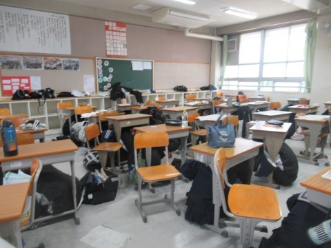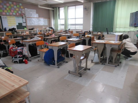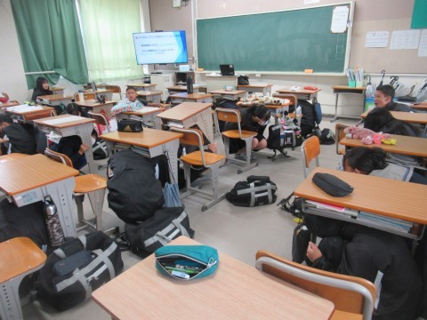本日は2時間目の時間帯、10時3分より「大阪府880万人訓練」がありました。事前に、担任の先生からパワーポイントや映像資料を使って防災教育、そのあとは机の下に頭部を隠して避難。良い雰囲気感ですることができました。そのあとは担任の先生を交えて、ゆったりとした時間を過ごせたようです。
