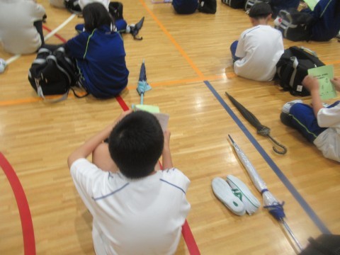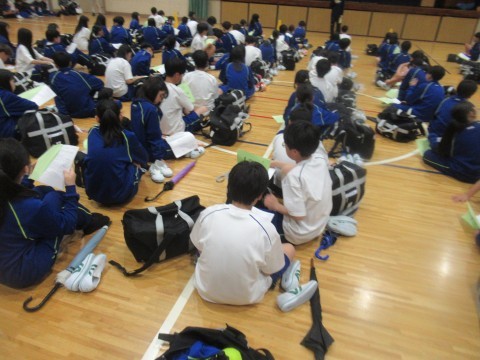 部活動紹介では、2つ上の先輩(3年生)が中心となって各部活の特徴について話をしてくれました。今日はあいにくの天気だったので、見学は思うようにいかなかったかもしれませんが、来週月曜日・火曜日は体験ができますので、気になっている部活にはどんどん行きましょう!(冊子に保護者さんのサインがないと、体験できません!注意しましょう)