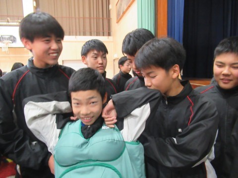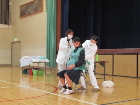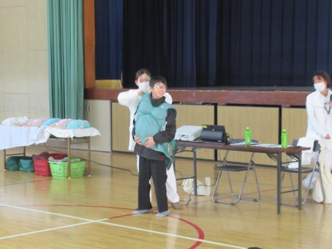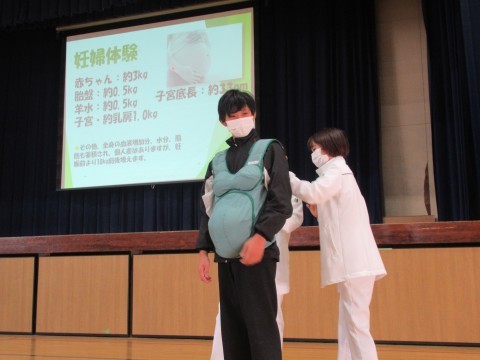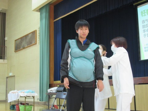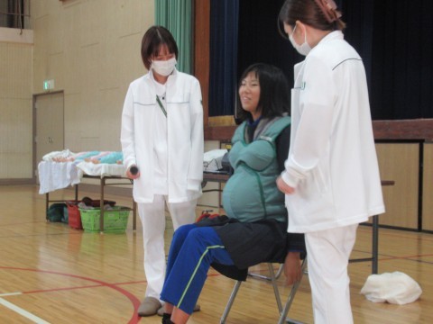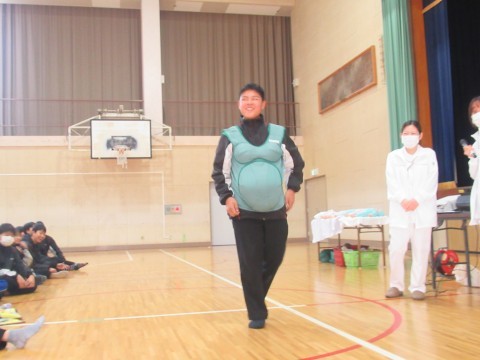 実際に妊婦体験も行い,靴下をはいたり,起き上がることがとても大変だということを