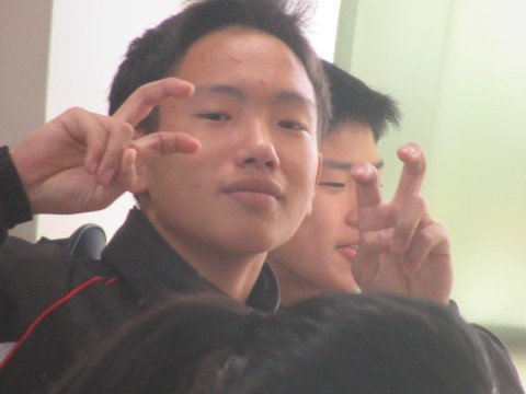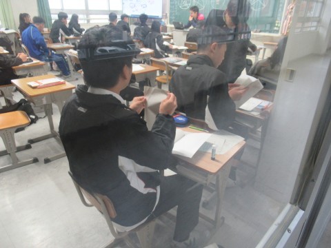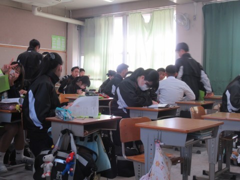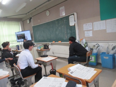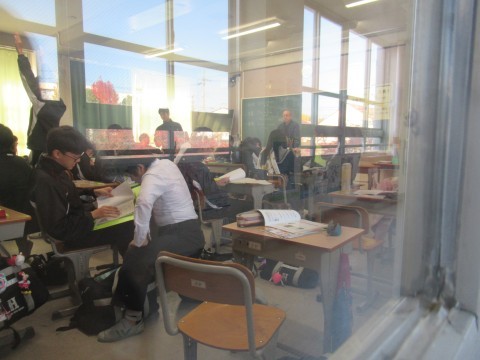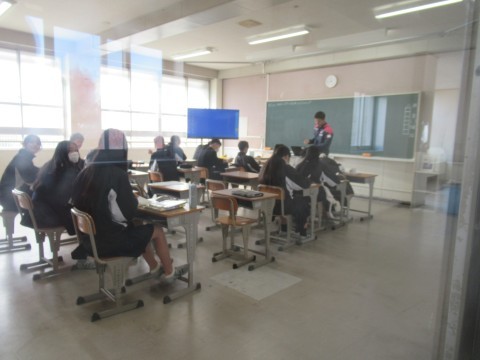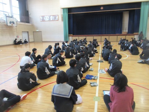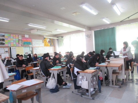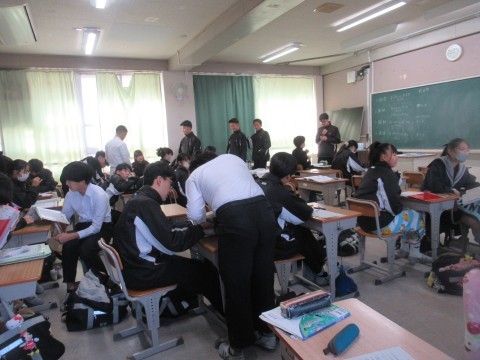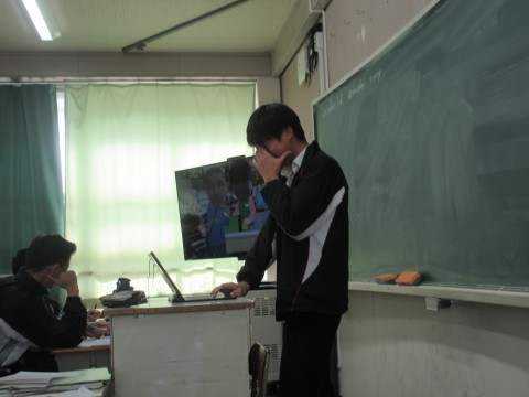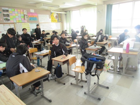 6時間目は面接練習に向けた事前指導が行われ、各クラス趣向を凝らした練習をしていました。模擬練習として「ダメな例」「いい例」を生徒や先生にやってもらったり…(先生の態度の悪さに、3組生徒、この顔です)(模擬練習ですのでご安心を!)