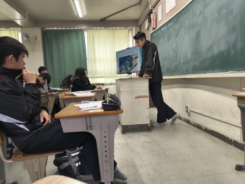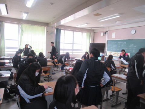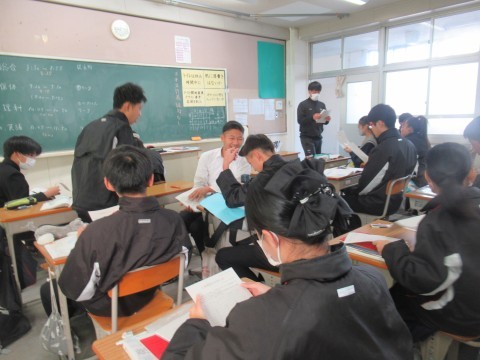 NSの先生に「このクラス、2時間目と6時間目、2コマ授業があるんだけど…」と相談すると、「じゃあ、ぼくが6時間目の授業をしてあげるよ」ということで、急遽6時間目はNSの先生の授業に!クリスマスが近いということもあり、最近学習した単元の文法も使いながら、アクティビティを!最後の大逆転劇には大盛り上がりで、最後には「先生ーありがとう!良いお年をー!」と、NSの先生に感謝の言葉を言う生徒もいました。3年生のNSの先生の授業は来年までありませんが、3学期も頑張っていきましょう!