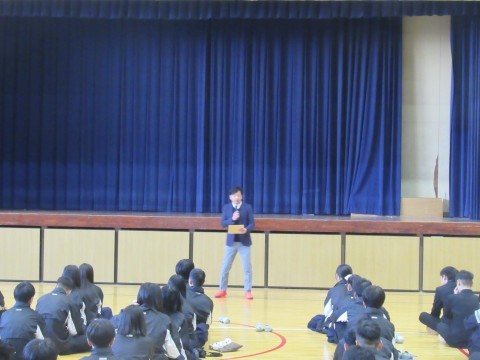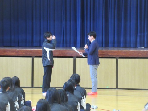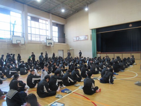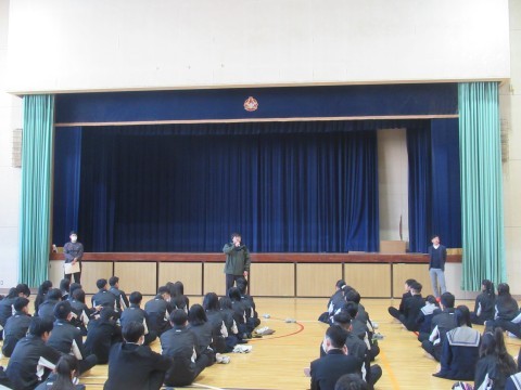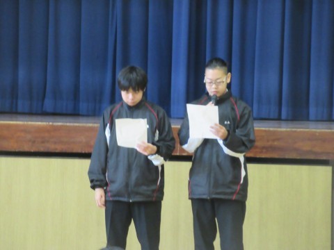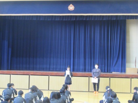 校長先生より「respectについて」 2年生の先生より「3年生への激励の言葉」 図書委員長より「冬休みの本の貸し出しについて」 生徒会より「挨拶運動について」
