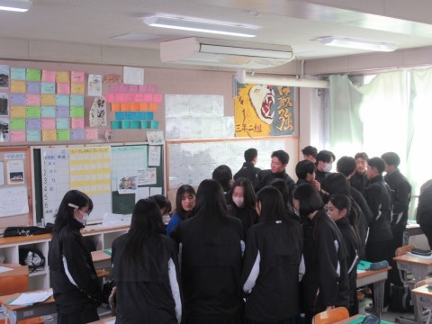 そして…体育委員から2学期最後の「クラスマッチ」について説明。まだまだ服装が乱れている人もいますが、「ここからクラスマッチに向けてやるべきことはしっかりやっていきましょう!」という声掛けも。そのあとは作戦会議!誰がどの競技に出るのか、リレーの順番は…などなど、各クラスが相談しているところ…