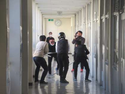 今回は、学活の時間中に校内に不審者が入ったと想定し、生徒への指示、教員間の連絡・連携、不審者への対応など実際に校舎を使って行いました。また、武器を持った不審者に扮した先生を取り押さえ(警察が来るまで時間を稼ぐ目的)たり、教室外にいてしまった生徒の安全確保のために探して対応することも行いました。