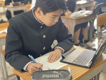 国語の授業では、名作「竹取物語」の暗唱テストが行われています。学生時代を思い出しながら『懐かしいな〜』と思って、応援しています。国語科教員からは「この学年の生徒、暗唱めちゃ頑張っている!」とうれしい一言。